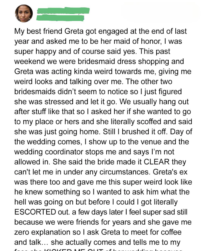 Days later, Greta finally agreed to meet Lila for coffee. There, Greta revealed her true feelings: she believed Lila had been losing weight to steal attention, especially because Greta’s ex-boyfriend Brian would be at the wedding. Greta even gave Lila an ultimatum: gain the weight back or leave her life. For the first time, Lila saw Greta’s insecurity clearly and chose to walk away, realizing she deserved to live her life without shrinking to fit someone else’s expectations.