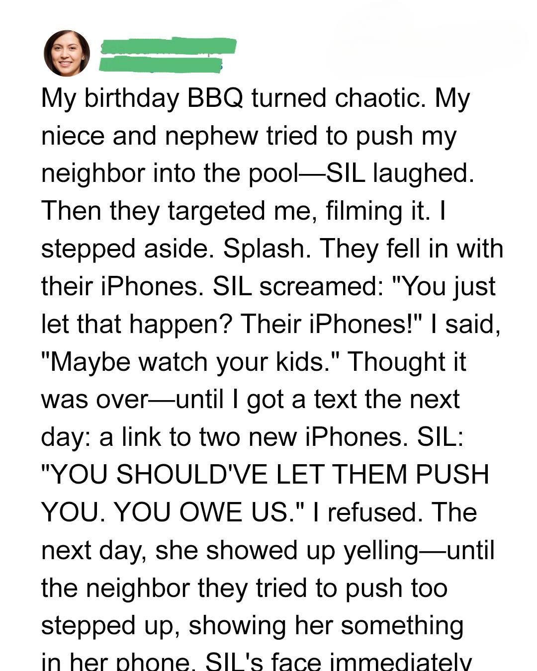 At the last second, I stepped aside, and they fell in instead, phones and all. Jessica’s reaction? She didn’t ask if they were okay. She gasped, “Their phones!” and immediately blamed me. I calmly reminded her that maybe she should’ve been watching them. The next morning, I woke up to a text from Jessica with a link to two very expensive phones, demanding I replace them.