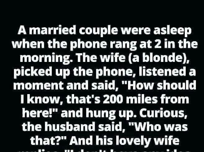 A married couple were asleep when the phone rang at 2 in the morning. The wife (a blonde) picked up the phone, listened for a moment, and said, Read more below