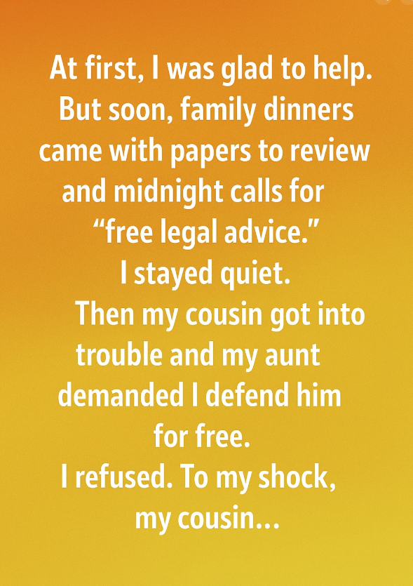 I stayed quiet, afraid of hurting anyone’s feelings.Then one day, my cousin got into serious legal trouble. My aunt called me, expecting me to represent him for free. I gently explained that while I cared deeply for the family, this case required too much time and responsibility for me to handle without proper compensation.