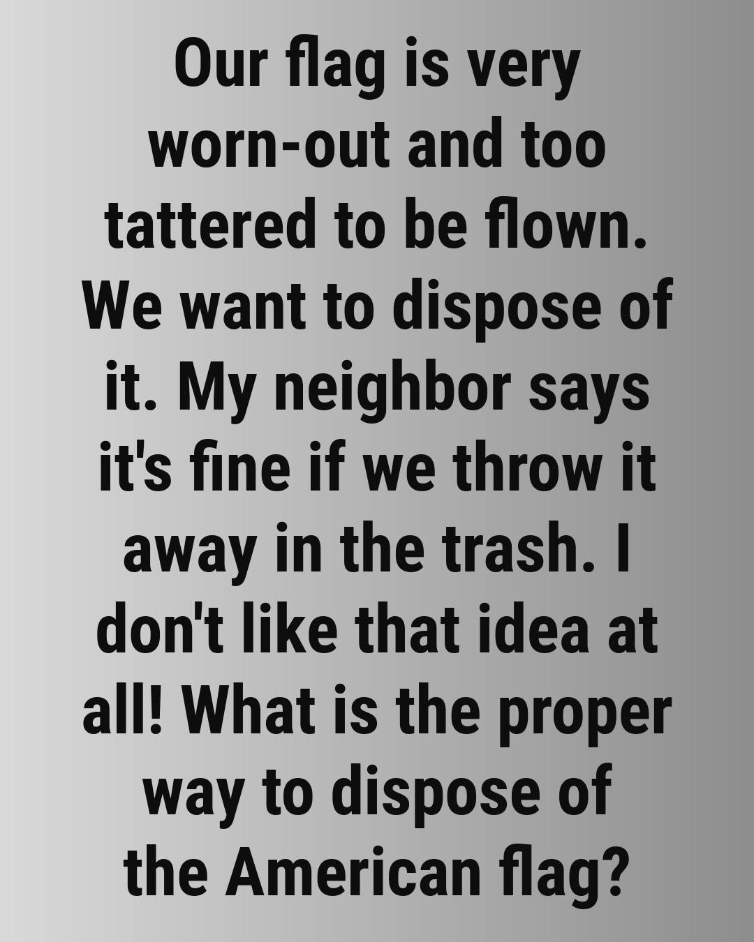 Treat the flag as more than a decoration. It has always provided an image of America, the freedoms that we argue about, fight for, and often try to live up to. Anything with that significance, how you dispose of it matters. Throwing it away with your coffee grounds and junk mail cheapens the symbol. That is why there are rituals of disposal to honor it.There are Multiple Ways to Dispose of a Flag