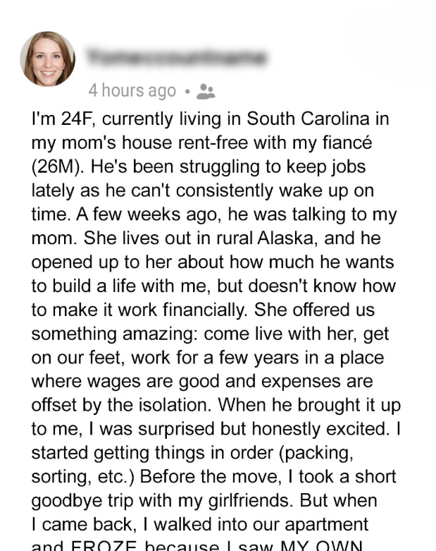 When my fiancé, Jake, suggested moving to Alaska to live with my mom for two years so we could save money for a wedding and a home, I agreed immediately. I imagined it as the start of our future together. In the weeks before the move, I was filled with excitement. My friends even took me on a small weekend getaway to say goodbye. When I returned home earlier than planned, I was surprised to see my boxes packed neatly by the door but none of Jake’s things were packed. “Jake, what’s going on?” I asked.