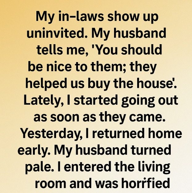 My in-laws show up uninvited. My husband tells me, ‘You should be nice to them; they helped us buy the house.’ Lately, I started going out as soon as they came. Yesterday, I returned home early. My husband turned pale. I entered the living room and was horrified… I froze at the doorway. The room was covered with open boxes, papers, and old photographs scattered everywhere. My in-laws were sitting on the floor, holding family albums I had never seen before.