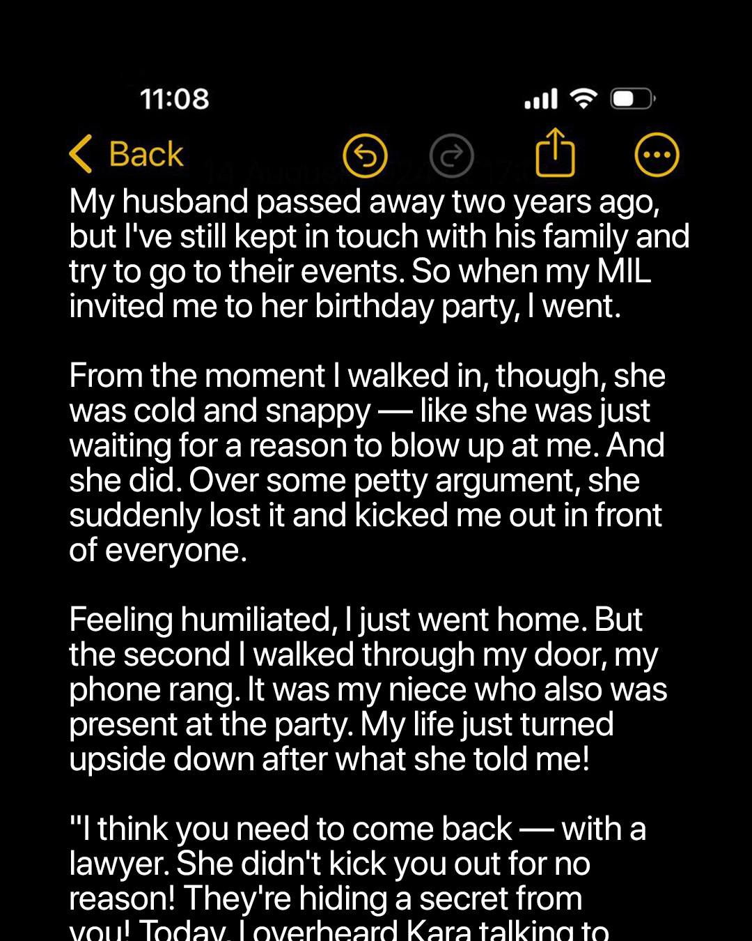 Melissa attended her late husband Mark’s mother Kara’s birthday party, hoping to honor Mark and his grandmother Eleanor’s memory. Kara had never been warm toward Melissa, and the evening was filled with subtle jabs and uncomfortable moments. Eventually, Kara’s hostility boiled over — she publicly told Melissa to leave, declaring she no longer belonged in the family. Heartbroken, Melissa left quietly, unaware that Kara’s actions were fueled by more than spite.