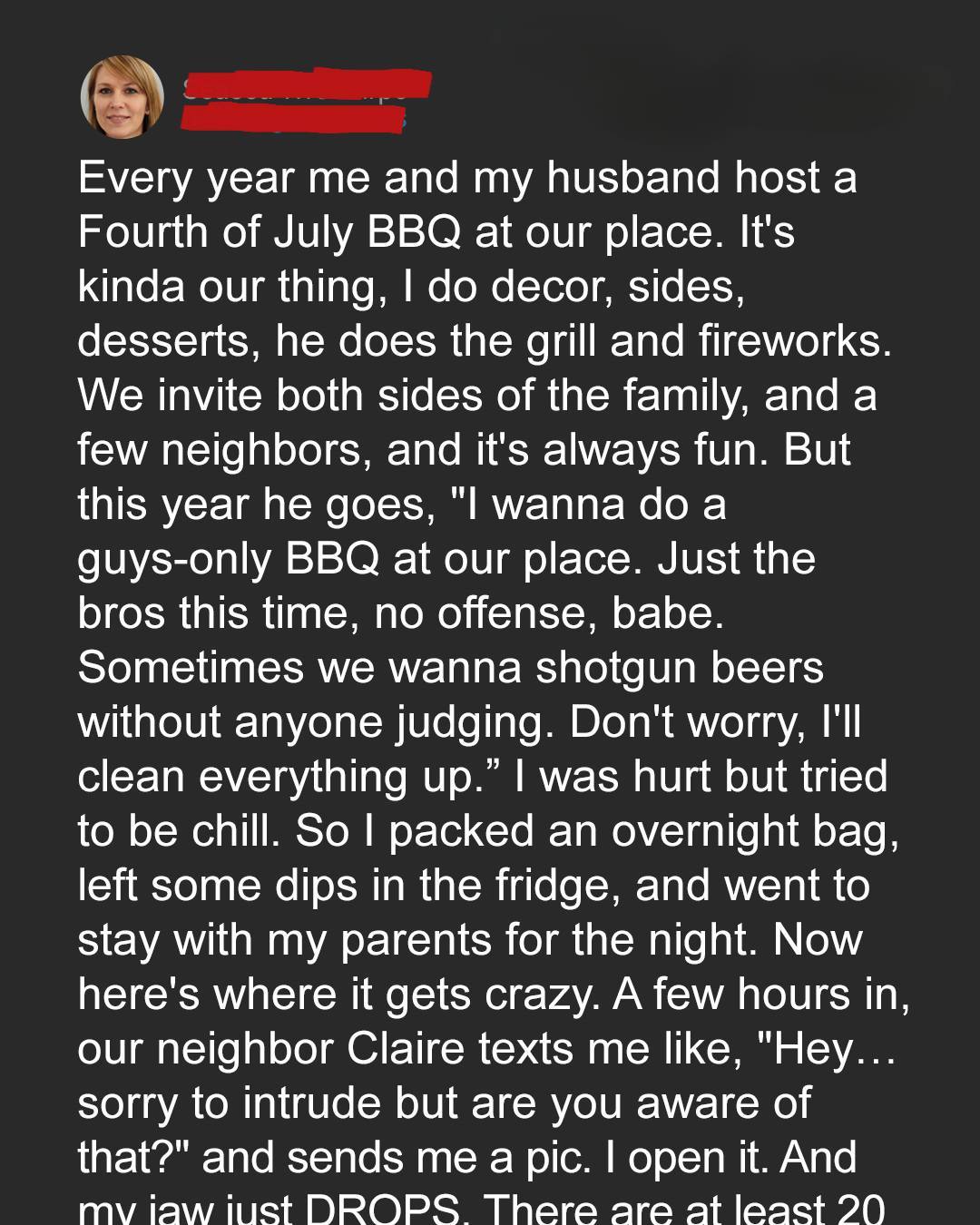 When my husband, Connor, told me this year’s 4th of July BBQ would be “guys-only,” I tried not to take it personally. He said it would just be a small get-together with his friends so they could relax and be casual. Even though it stung a little, I agreed and decided to spend the weekend at my parents’ house.Connor and I have been married for four years, and we live in a home that my parents helped me buy with savings and a small inheritance from my grandfather.