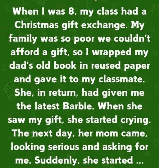 My family was so poor we couldn’t afford a gift, so I wrapped one of my dad’s old books in reused gift paper and gave it to my classmate. She, in return, had given me the latest Barbie. When she saw my gift, she started crying.