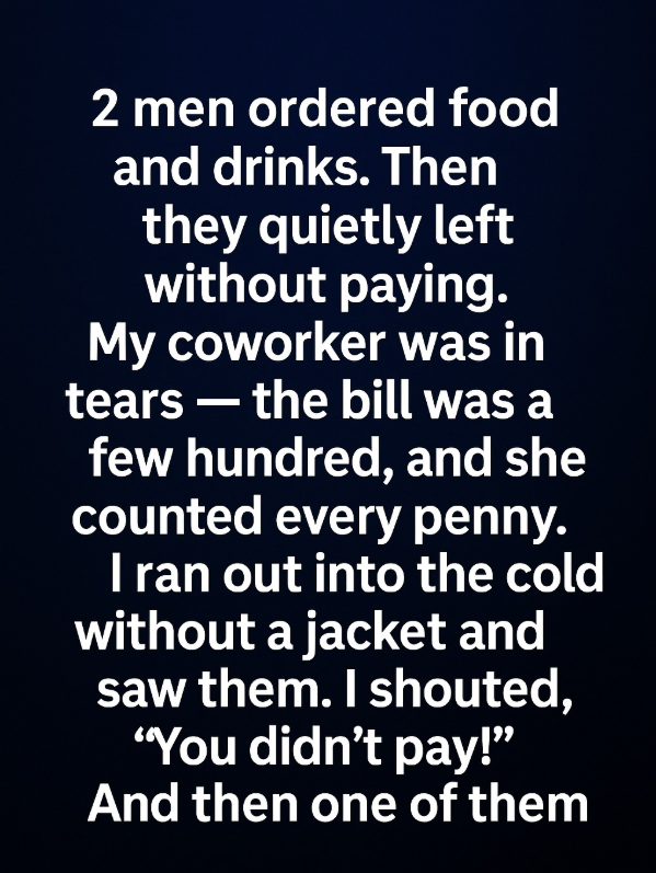 Seeing her so upset, I couldn’t just stand there. Without thinking, I ran outside into the freezing night, no jacket on, my breath coming out in white clouds. Down the street, I spotted them.“You didn’t pay!” I called out, my voice trembling more from nerves than the cold.The two men turned around, startled. For a moment, there was silence. Then, one of them sighed deeply and walked toward me.