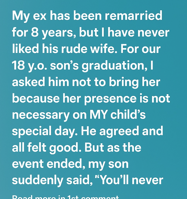 My ex-husband has been remarried for eight years, but I’ve never felt comfortable around his wife. For our son’s high school graduation, I asked him not to bring her, explaining that I wanted the day to focus entirely on our son and his accomplishments. He agreed, and I felt relieved knowing it would be a calm, happy moment for our family.