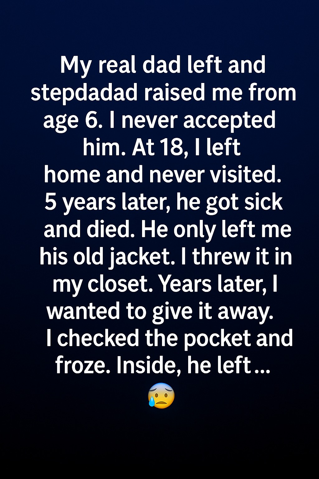 Angry and hurt, I tossed the jacket into the back of my closet, refusing to look at it. To me, it was just a symbol of the man I never appreciated. Years passed. One day, while cleaning out my closet, I decided to donate the jacket. Before folding it, I slipped my hand into the pocket and froze. Inside was a small, folded note and an old photograph of me as a child, missing my two front teeth and grinning wildly.