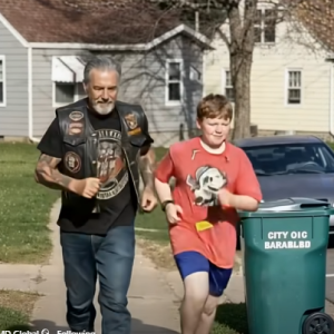 For three months, I watched from my kitchen window as a stranger in a leather vest jogged beside my thirteen-year-old son, Connor, every morning at exactly 6…