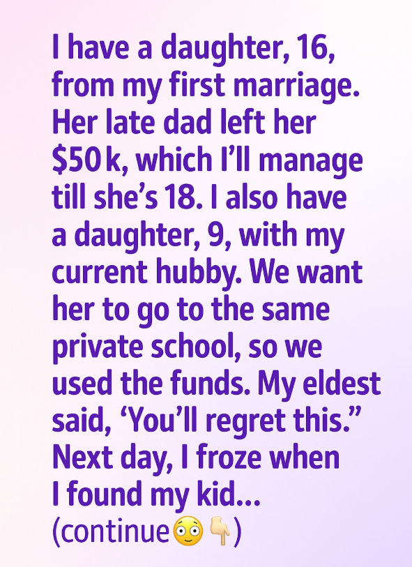 I have a daughter, 16, from my first marriage. Her late dad left her $50k, which I’ve been managing for her until she turns 18. I also have a younger daughter, 9, with my current husband. We wanted our youngest to attend the same private school as her sister to give them both equal opportunities. Since we were struggling financially, we decided to use some of the money her late father had left behind.