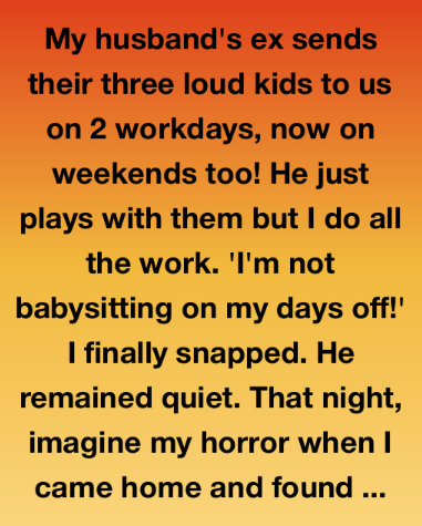 My husband’s ex sends their three loud kids to us on 2 workdays, now on weekends too! He just plays with them but I do all the work. ‘I’m not babysitting on my days off!’ I finally snapped. He remained quiet. That night, imagine my horror when I came home and found the kids had unpacked ALL their things — toothbrushes, clothes, even their school stuff. They weren’t visiting anymore. They were moving in.