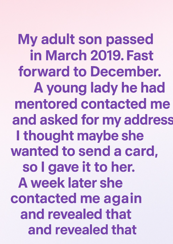 My adult son passed in March 2019. Fast forward to December. A young lady he had mentored contacted me and asked for my address. I thought maybe she wanted to send a card, so I gave it to her. A week later, she contacted me again and revealed that she had something very important to share. She told me that during the time my son was mentoring her, he had inspired her to pursue her dreams fearlessly.