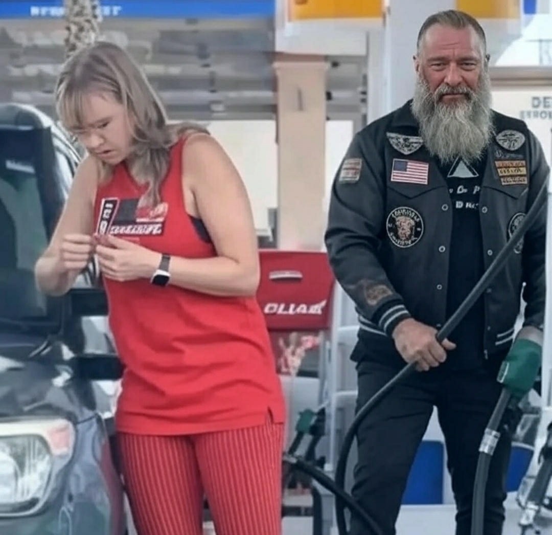 I turned and saw him walking toward us. A skinny guy trying too hard to look tough — tank top, cheap tattoos, that angry swagger some men use to disguise cowardice. He took one look at his girlfriend, then at the gas pump, and his face went sour.