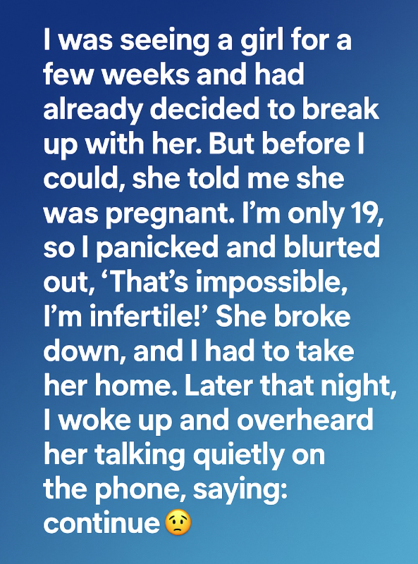 Before I could, she told me she was pregnant. I’m only 19, and the words hit me like a truck. In my panic, I blurted out, “That’s impossible — I can’t have children.” She froze. Tears welled up in her eyes, and she broke down, crying uncontrollably. I didn’t know what to do, so I drove her home in silence.
