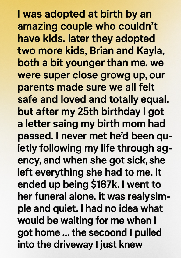 Growing up, I always believed I was one of the lucky ones. I was adopted as a baby by loving parents and later gained two adopted siblings, Brian and Kayla. We were told we were all “chosen” and equal, and for years, I believed it. On my 25th birthday, everything changed. I received a letter from a lawyer: my birth mother, Alina, had passed away and left me her entire estate — $187,000. I was overwhelmed with emotion and expected my family to support me.