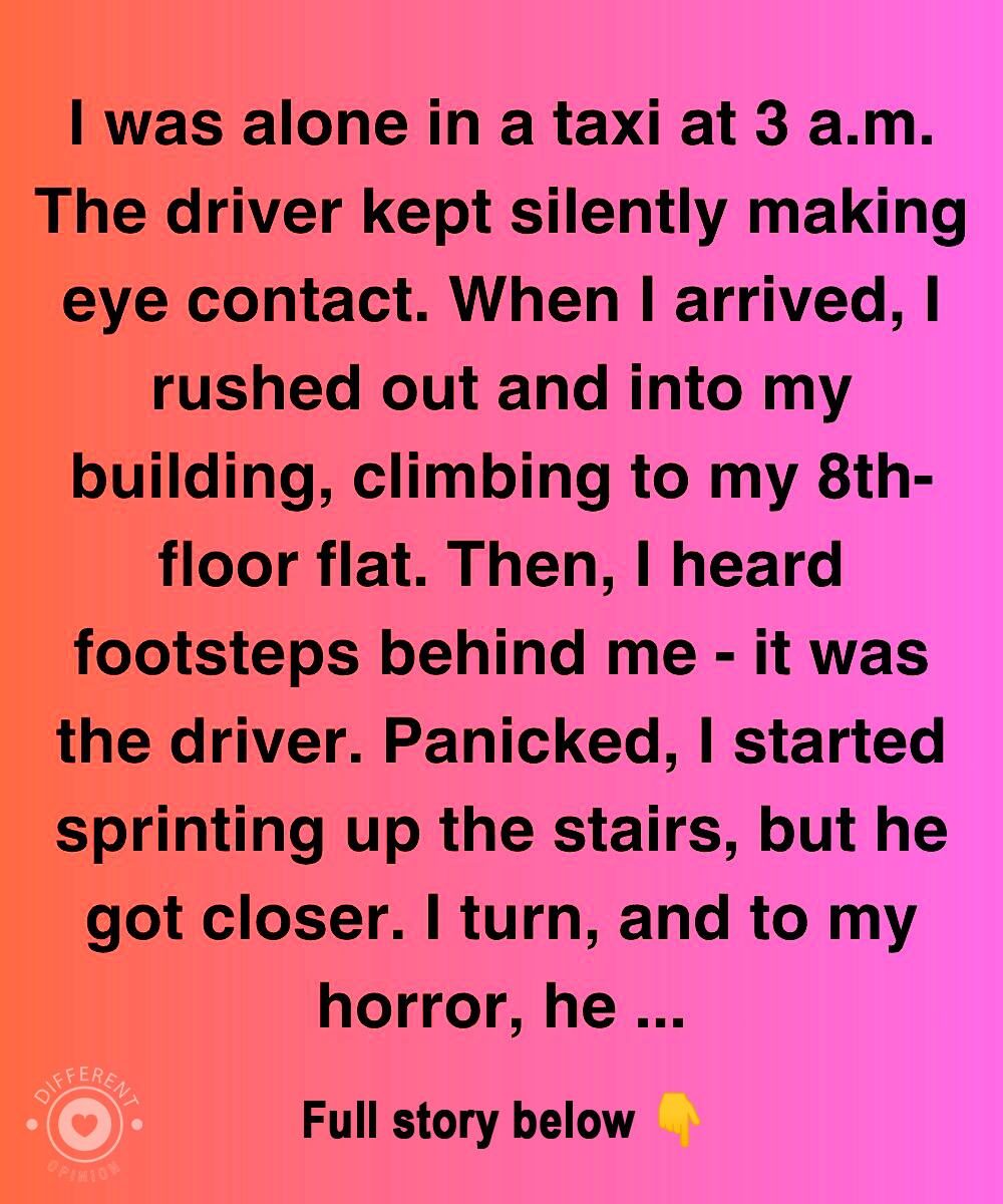 I was alone in a taxi at 3 a.m. The driver kept silently making eye contact. When I arrived, I rushed out and into my building, climbing to my 8th-floor flat. Then, I heard footsteps behind me — it was the driver. Panic surged through me. My heart pounded in my chest as I started sprinting up the stairs. His footsteps grew louder, faster, closing the gap between us. My mind was racing with terrifying thoughts. Why was he following me? What did he want?