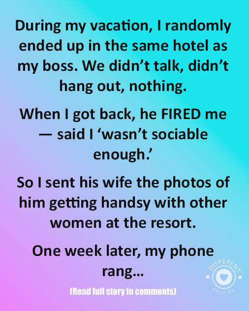 However, when I got back, everything changed. My boss called me into his office and abruptly fired me. His reason? He claimed I “wasn’t sociable enough” during the trip. I was stunned. My performance had always been strong, and the vacation wasn’t a work event. It felt unfair and personal. That’s when I remembered the photos I had seen during my stay—photos of him acting inappropriately with strangers at the hotel bar.