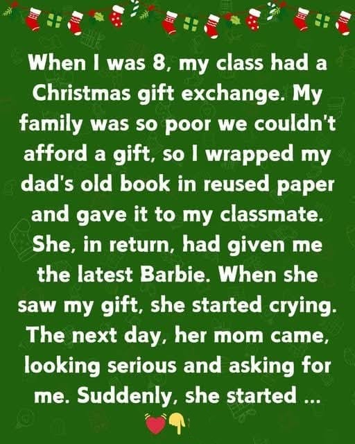 My family was so poor we couldn’t afford a gift, so I wrapped one of my dad’s old books in reused gift paper and gave it to my classmate. She, in return, had given me the latest Barbie. When she saw my gift, she started crying.