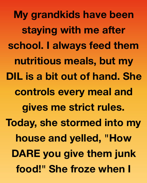 My grandkids have been staying with me after school. I always feed them nutritious meals, but my DIL is a bit out of hand. She controls every meal and gives me strict rules. Today, she stormed into my house and yelled, “How DARE you give them junk food!” She froze when I silently turned the red cardboard box around to face her.