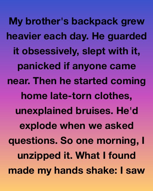 My brother’s backpack grew heavier each day. He guarded it obsessively, slept with it, panicked if anyone came near. Then he started coming home late—torn clothes, unexplained bruises. He’d explode when we asked questions. So one morning, I unzipped it. What I found made my hands shake: I saw rolls of cash. Thousands of dollars. And underneath them, a switchblade.