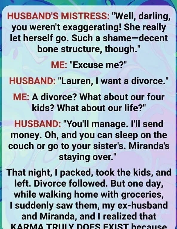 I started waking up early just to breathe before the chaos began. I read books again, made healthier choices, cleared clutter, and created routines that nurtured us instead of exhausting us. Friends returned, new connections formed, and laughter slowly filled the space that had once been tense and unpredictable. The kids blossomed in a home built on honesty, not hostility. Months later, carrying groceries with my mind elsewhere, I spotted my ex and Miranda across the street. The confident couple that once shattered my life looked frayed. He was fumbling with bags; she was snapping at him without restraint.