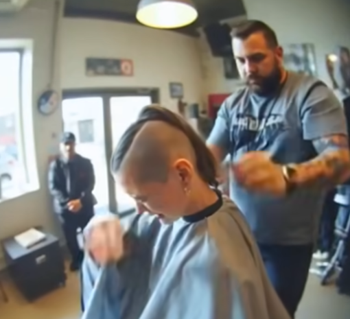 As the clippers buzzed, the barbershop suddenly fell quiet. Her soft sobs echoed in the room. Then, a warm hand touched her shoulder.