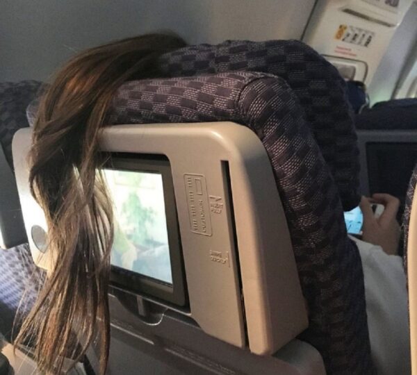Her hair spills over the back of her seat, completely blocking the rear passenger’s view of the in-flight entertainment screen.