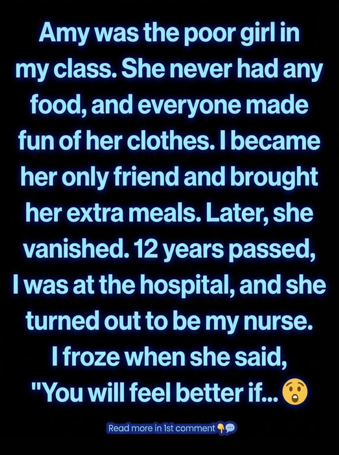When the nurse walked in to check my vitals, I recognized her eyes before anything else. She smiled gently and said my name, and suddenly it all came together. It was Amy—confident, calm, and composed in her uniform. She didn’t mention the past right away. She simply did her job with care, explaining each step, making sure I was comfortable. When she finally spoke more personally, her voice was steady and kind. She said life had taken her through difficult places, but also toward people who believed in her—people who helped her keep going when it felt impossible.