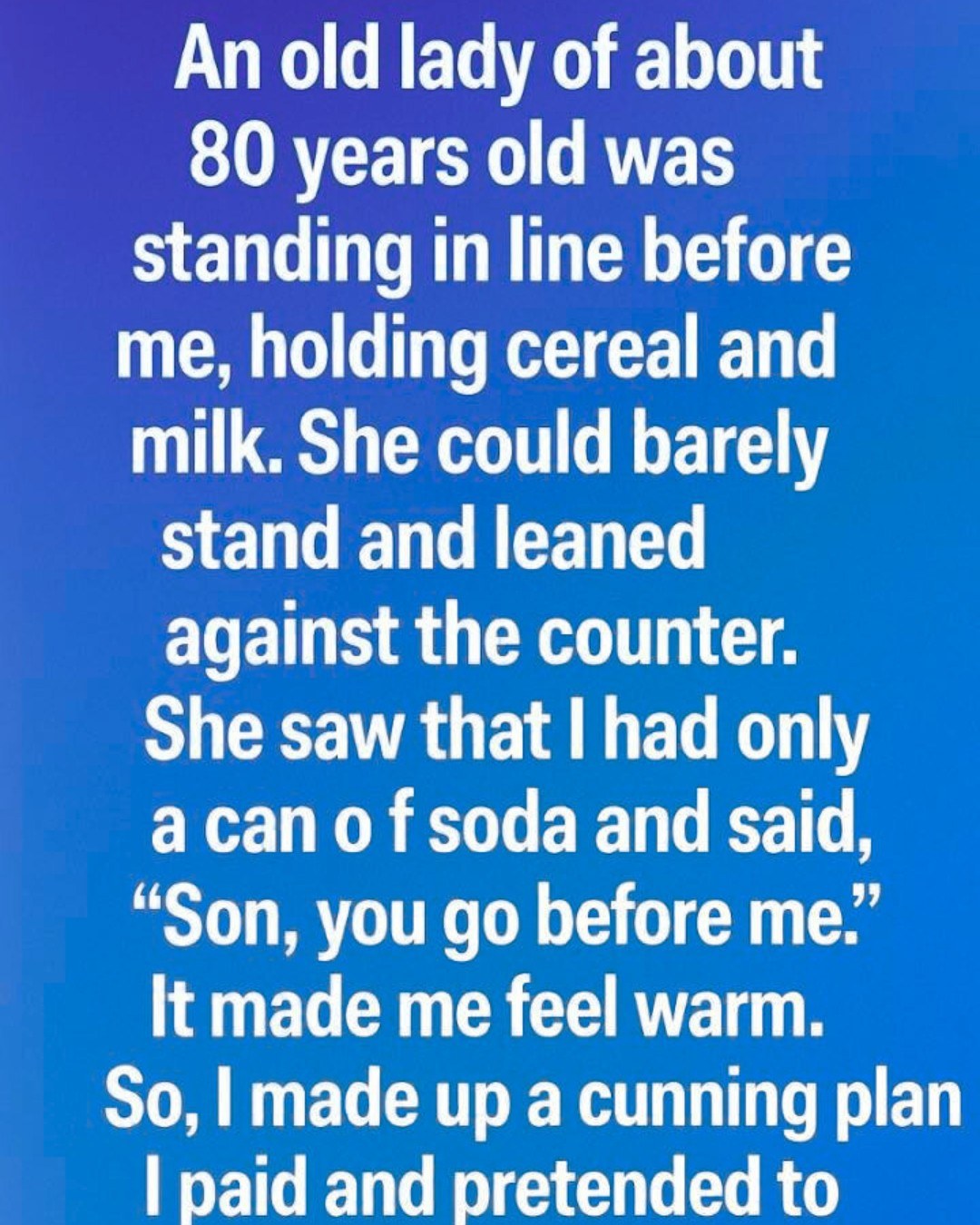 An elderly woman—well into her eighties—stood in line ahead of me, holding a small box of cereal and a carton of milk.
