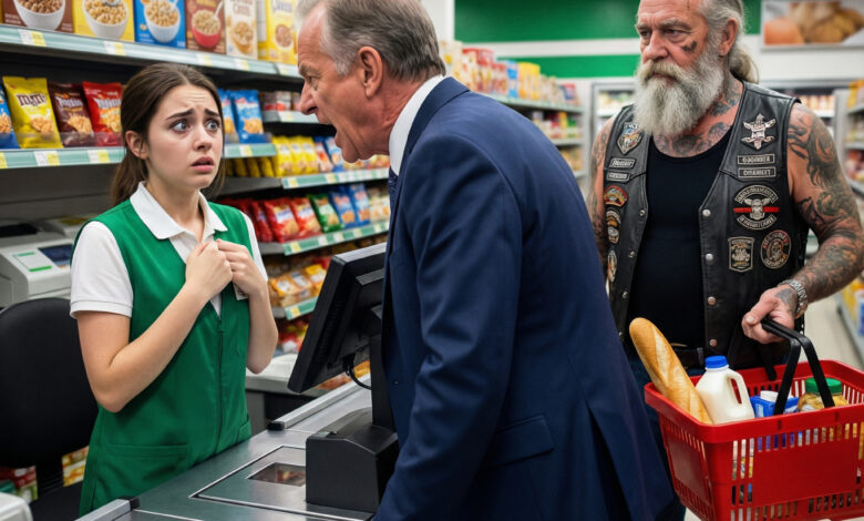 The grocery store was packed the way it always is around six in the evening—exhausted workers grabbing dinner, parents juggling kids, people just trying to get through the day. I was standing in line behind a giant of a man in a leather vest, patches covering his back like a history book, when the register in front of us froze. Completely locked up.