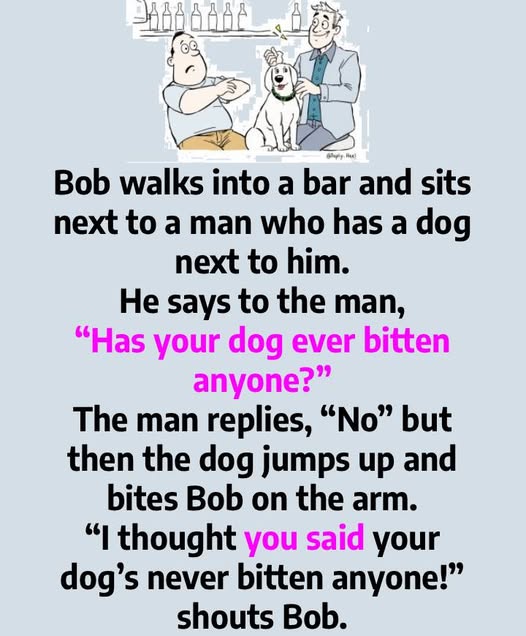 Without warning, the dog leaps up and clamps its teeth onto Bob’s arm. Chaos follows. Bob yells, the chair scrapes backward, and suddenly everyone in the bar is paying attention. Furious and confused, Bob turns to the man and shouts that he was told the dog had never bitten anyone.