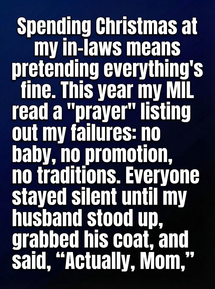Every holiday season, visiting my in-laws came with an unspoken agreement: smile, nod, and keep everything pleasant no matter how tense it felt underneath. Christmas was especially challenging, wrapped in expectations I never seemed to meet. That year, the living room glowed with decorations and polite laughter, but I felt like I was walking on fragile glass. When my mother-in-law suggested we all pause for a “prayer,” I expected something brief and traditional. Instead, her words drifted into uncomfortable territory, touching on hopes for changes in people’s lives—careers advancing, families growing, traditions being “restored.” Each phrase landed heavier than the last, and I could feel the room growing still.