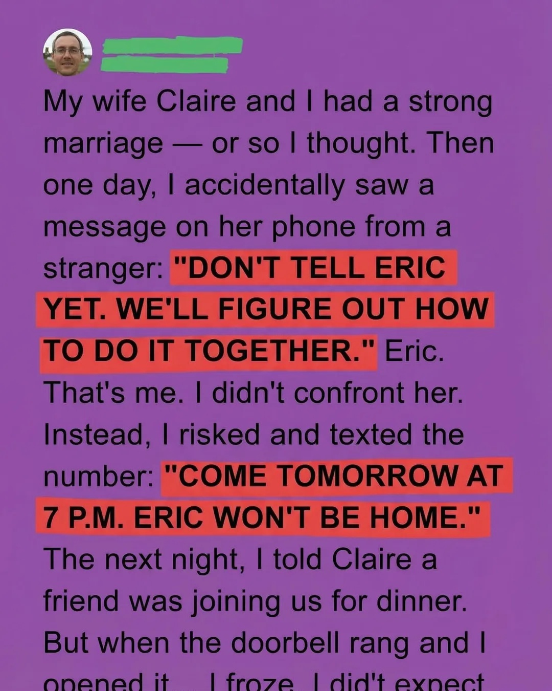 That night, I made a decision that surprised even me. I messaged the unknown number, inviting them over the next evening under the pretense that I wouldn’t be home. It wasn’t revenge I was after—it was clarity. I needed to understand what kind of truth had been unfolding behind my back. The following day, I told Claire a friend would be joining us for dinner. She smiled politely, though I noticed a flicker of unease she didn’t try very hard to hide. We cooked together, spoke about ordinary things, and pretended nothing was wrong. Yet every word felt heavier, like it carried something unspoken beneath it.