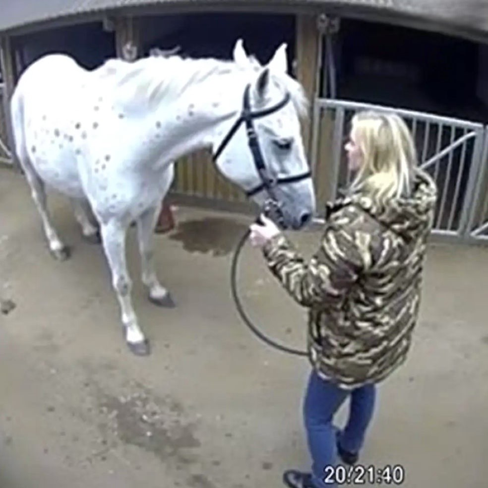 The horse stood behind her in the pen, white, restless, the muscles along his neck rippling like water beneath sunlight. He tossed his head once as if to test the air, then struck the gate with a hollow clang that made everyone nearby flinch.