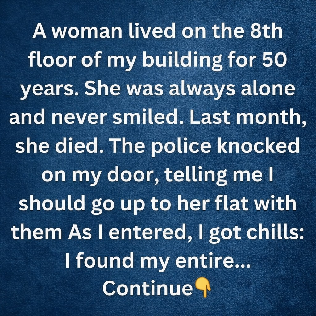 This woman had lived on the 8th floor of my building for 50 years. She was always alone, and never smiled. All the neighbors avoided her because she could start a fight at any moment. Last month, she died. The police knocked on my door, telling me I should go up to her flat with them.