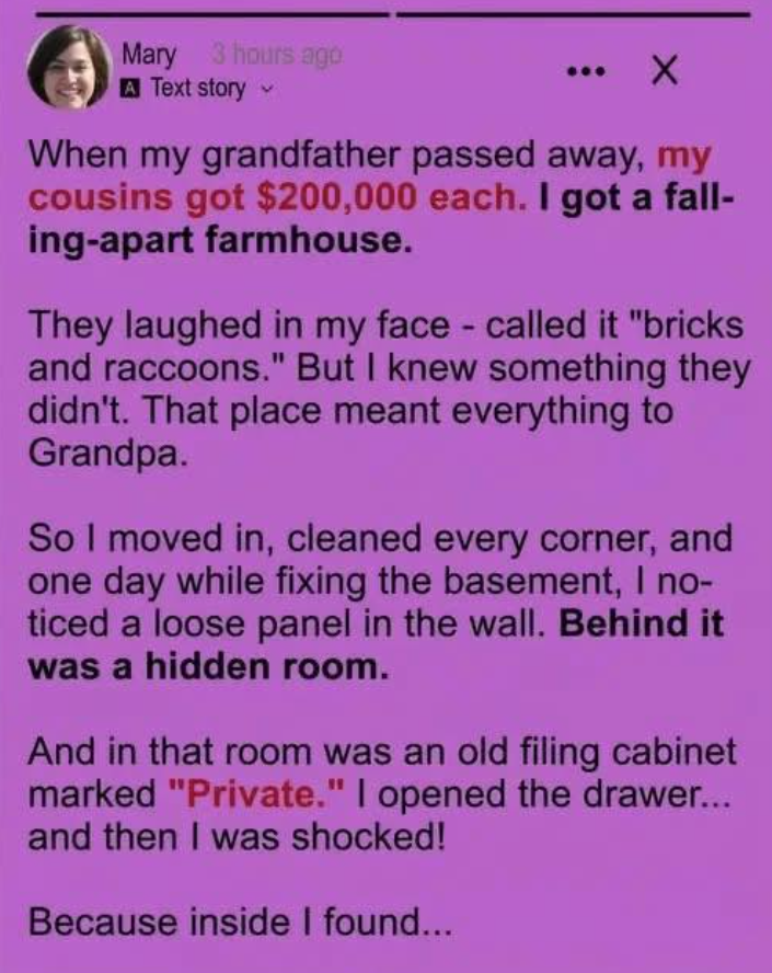 But the house my cousins mocked was the one place my grandfather had truly loved. I moved in alone, peeling back layers of dust and memory, until one day I found a hidden wall, a secret room, and a single metal cabinet mark… Continues…