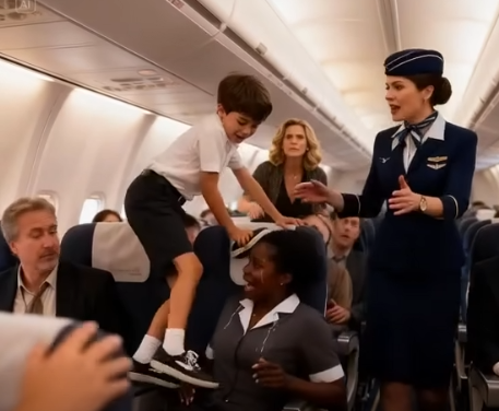 The trouble began shortly after takeoff when Amara, a 22-year-old student heading home to Chicago, felt a series of sharp kicks against the back of her seat. She turned politely to the young boy behind her, hoping for understanding, but the situation quickly escalated. Instead of guiding her son, the boy’s mother dismissed Amara’s request and openly blamed her for the disturbance. When a flight attendant calmly stepped in to help, the mother’s behavior worsened, creating tension throughout the cabin and making other passengers increasingly uncomfortable.