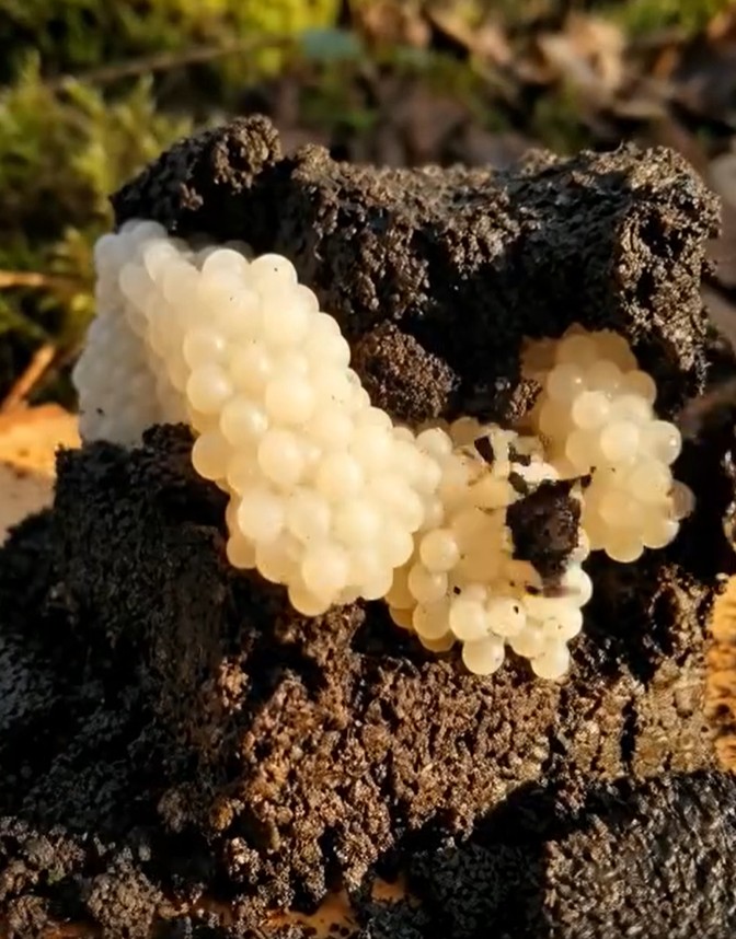 Up close, the spheres were smooth, round, and slightly translucent, with a soft sheen in the sunlight. Wearing gardening gloves, I gently moved the soil around them. They felt soft and squishy, not solid, which immediately suggested they were organic. Unsure what they were, I collected a few and examined them under brighter light indoors.