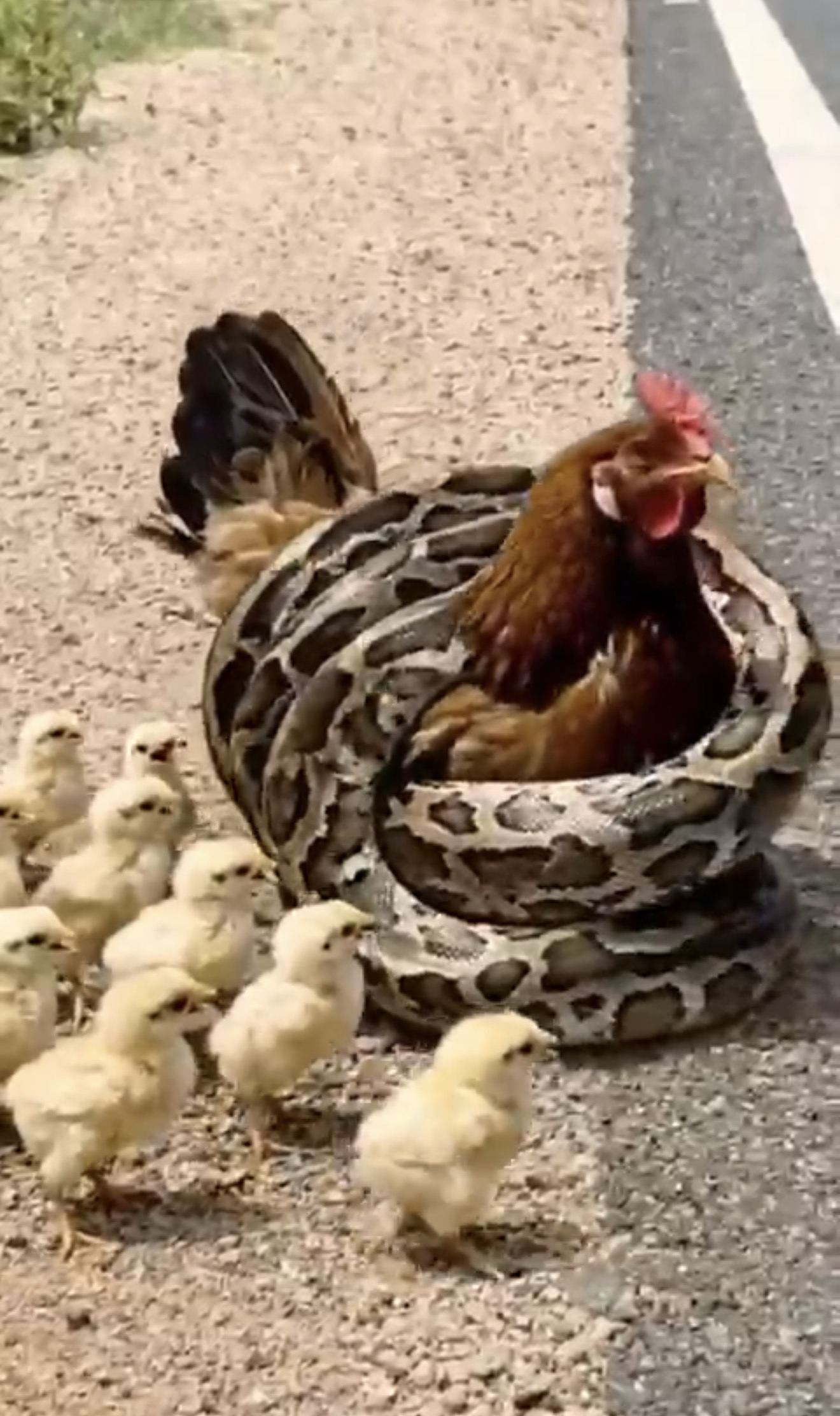 On a quiet roadside, a mother hen stands her ground—surrounded by her tiny chicks and wrapped in an unexpected moment of danger.
