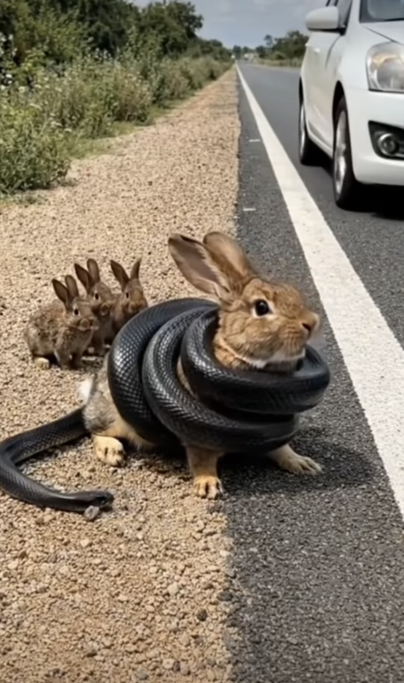 A brave little rabbit faces danger on the roadside while its babies wait behind.