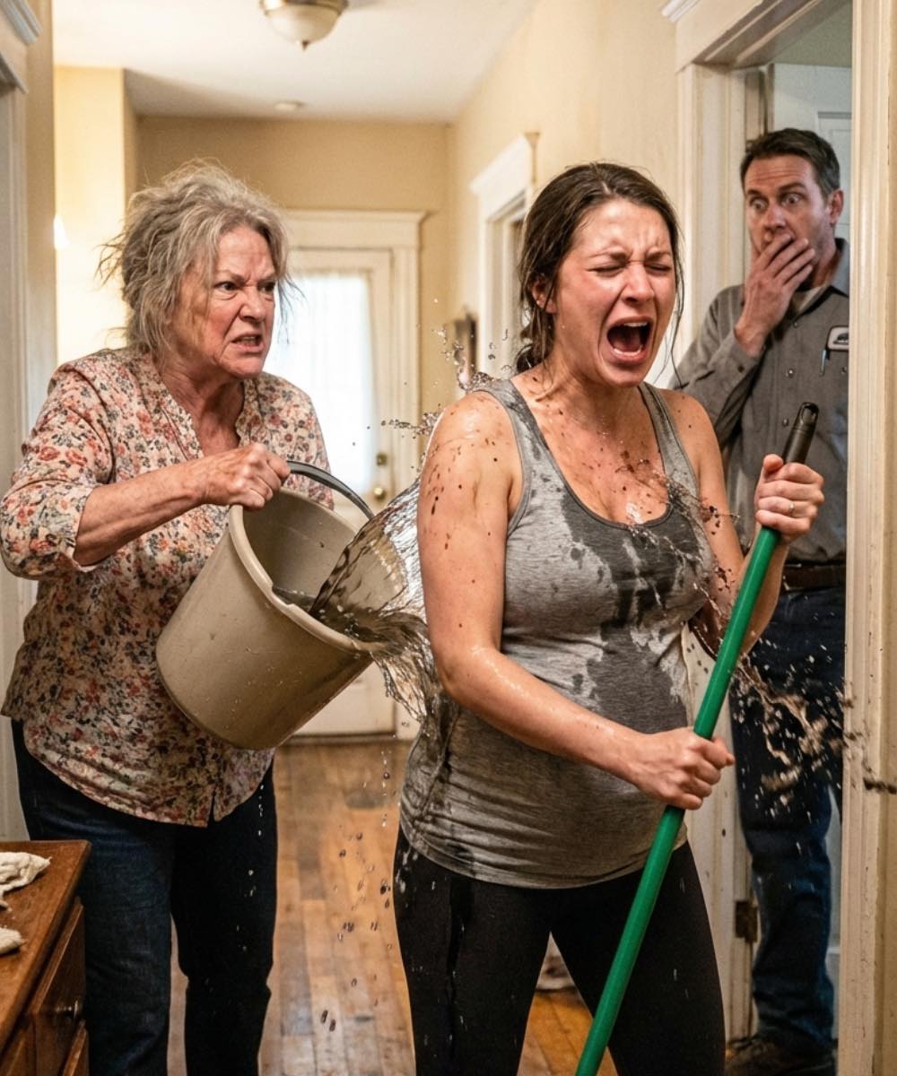 Before him stood his mother, still gripping the bucket, and his wife—shivering, wet, and trembling, her eyes wide with disbelief. For a split second, time seemed to pause.