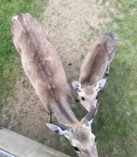 They appeared without warning, stepping out from the treeline while I tossed hay near the fence. Calm and unafraid, the larger deer stayed close, alert and steady. The smaller one stared at me with wide, curious eyes.