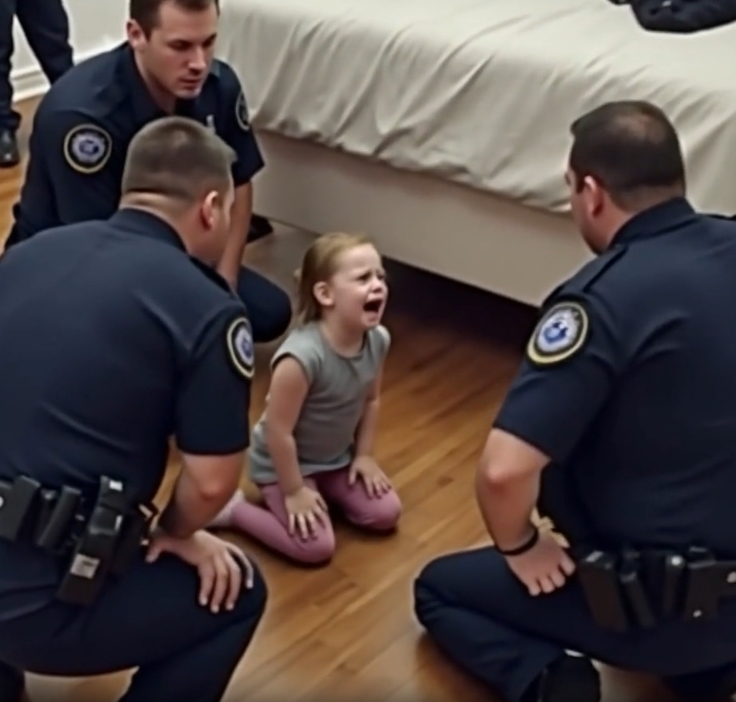 Ten minutes later, police arrived at the suburban home. Mia, clutching her teddy, led them to her bedroom. Officers checked beneath the bed—nothing but dust and toys. One officer gently reassured the girl it was just her imagination, but another motioned for silence. In that moment, the entire house fell eerily…