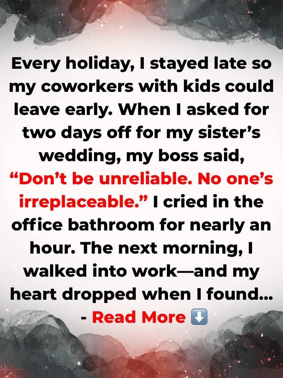 Every holiday, I stayed late so my coworkers with kids could go home. When I asked for 2 days off for my sister’s wedding, my boss said: “Don’t be unreliable. No one’s irreplaceable.” I cried in the office bathroom for almost an hour.