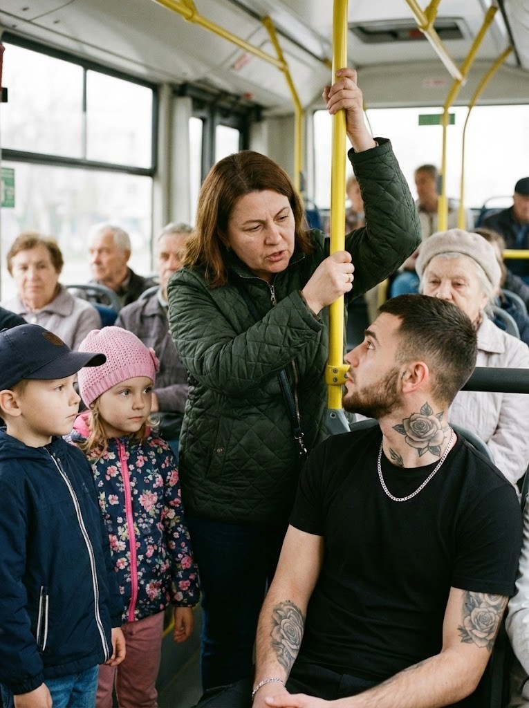 The bus was packed with older individuals discussing the weather and grocery prices. A young man of eighteen years sat quietly in an aisle seat while looking exhausted. He wore a dark shirt that showed tattoos on his arm and neck which made some people look at him with suspicion. At the next stop a mother boarded with two small children and began searching for a place to sit. Since the cabin was full she quickly focused on the young man and demanded that he stand up for her. She was irritated and spoke loudly so that everyone nearby could hear her request for his seat.