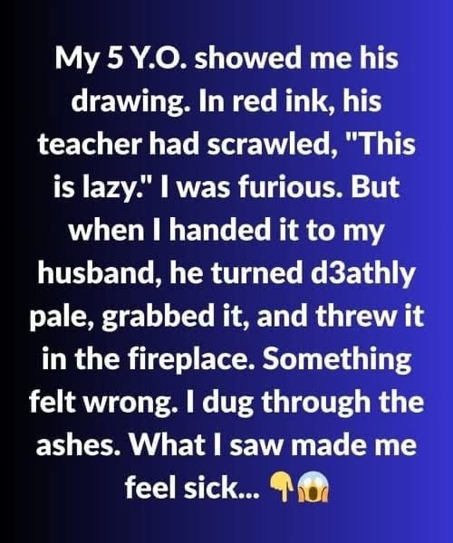 My 5 Y.O. showed me his drawing. In red ink, his teacher had scrawled, “This is lazy.” I was furious. But when I handed it to my husband, he turned deathly pale, grabbed it, and threw it in the fireplace. Something felt wrong. I dug through the ashes. What I saw made me feel sick. On the back, in , in his handwriting: “Last night was a mistake. My wife is getting suspicious.” The late nights. The lies. It wasn’t work. It was her. And that note? It wasn’t for my child. It was for me. She wanted me to know. She wanted me gone. Fine. Divorce is already on the table.