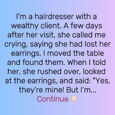 even years later. One could say that people who work with people don’t have boring jobs. “I cut hair for a living.” My client is very wealthy. A few days after her visit, she broke down in tears and told me she had lost her earrings. Didn’t I find them?
