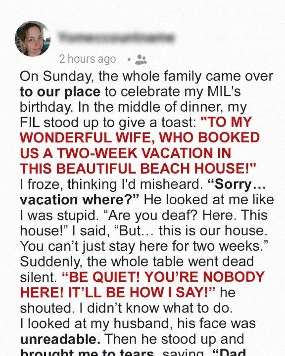 I was too stunned to be polite. “But… this is our house. You can’t just… you can’t just stay here for two weeks without even asking us.”