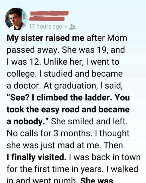 I studied obsessively. I chased every rung of the ladder people call success. University.Graduate school. A career everyone praised. At my graduation, wrapped in a stiff gown and applause, I searched the crowd.She was sitting in the back row, clapping softly, eyes shining like this moment belonged to her more than to me. When I hugged her, pride overflowed—too much pride. “See?” I laughed.“I made it. I climbed up. You chose the easy path and ended up a nobody.”The words fell between us, heavier than I expected.She didn’t argue. She didn’t defend herself. She only smiled—a thin, tired smile—and said, “I’m proud of you.”Then she walked away.Three months passed. No calls. No messages.I told myself she needed space. I told myself she was strong. I was busy anyway—new city, new job, new life.